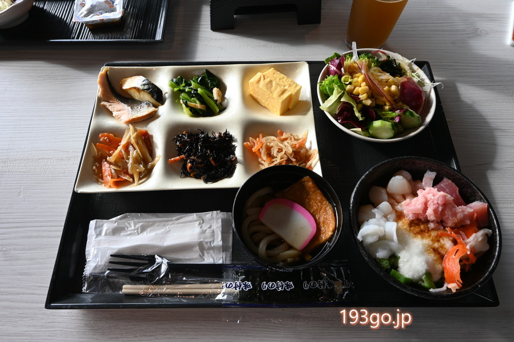 名物のっけ丼は、ご飯の上にネギトロやマグロ、ホタテ、イカ、カニカマ、オクラにとろろなどを盛り付け、豪華な海鮮丼のできあがり。モリモリにしたとろろ&海鮮に出汁醤油を垂らして…至福の朝ご飯。