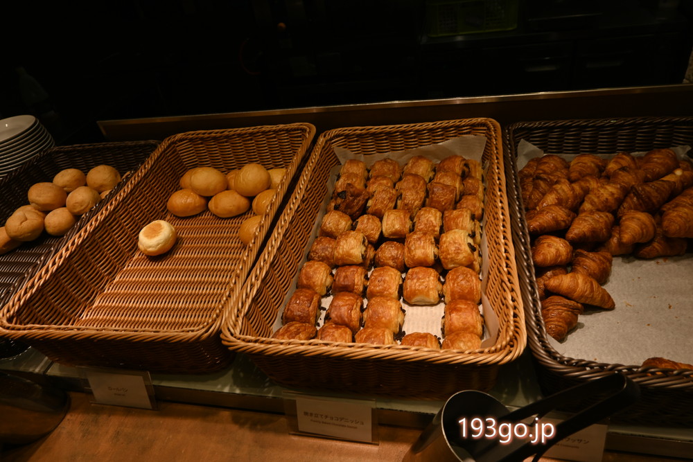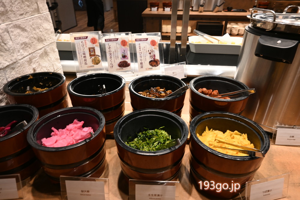 ビュッフェ台には、サラダやフルーツ、焼きたてパン、湯豆腐や温泉卵の他、白米に合うおかずも多種類。焼き魚はお席で炙って食べられるのも楽しい!