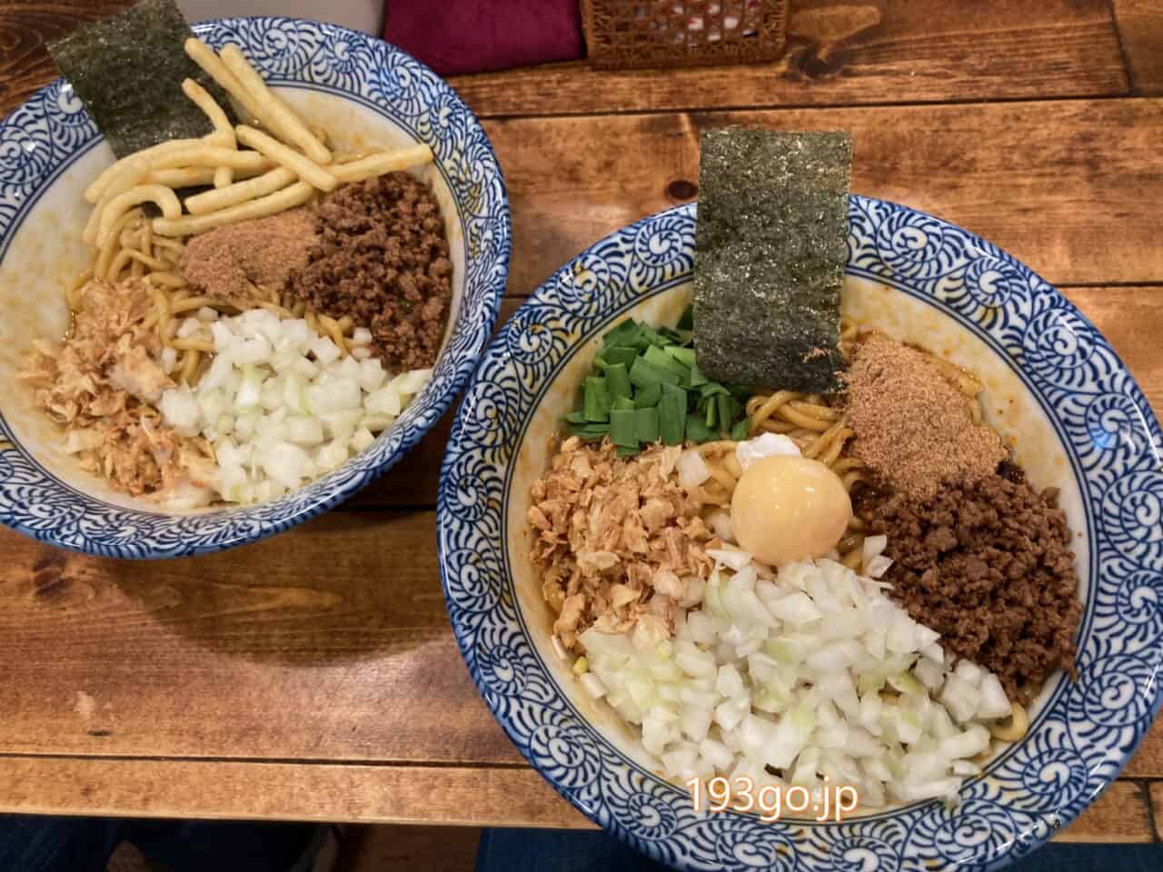 台湾まぜそばの方の具は、卵とニラ入りで、スナックなし、スパイスでは無く、魚粉かな?