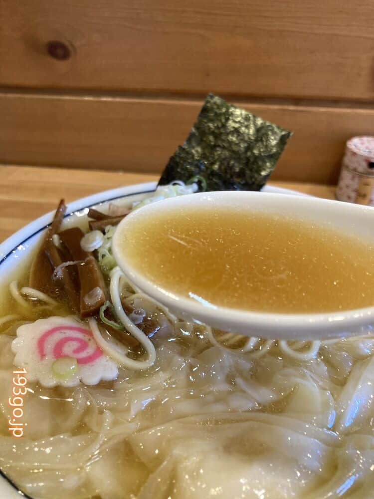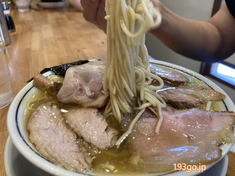 スープはアッサリながら出汁が効いた、少しとろみがあり旨みたっぷりの淡麗煮干し。アツアツなのに次々と飲みたくなる。