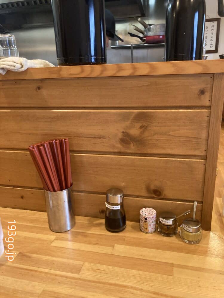 卓上にはチャーシュー丼のタレ、一味、青唐辛子味噌、からし。