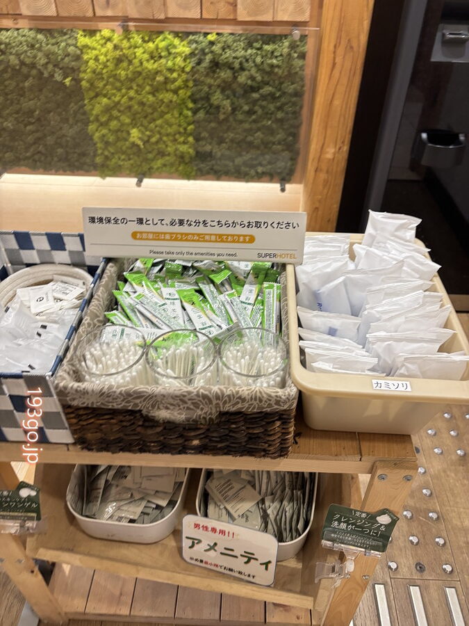 スーパーホテルでお馴染みの選べる枕、アメニティバイキング、ウェルカムバー、温泉大浴場、朝食バイキングなどの無料サービスが充実。