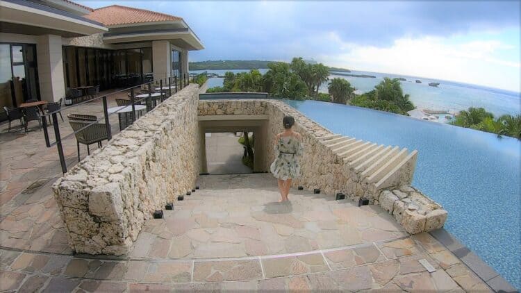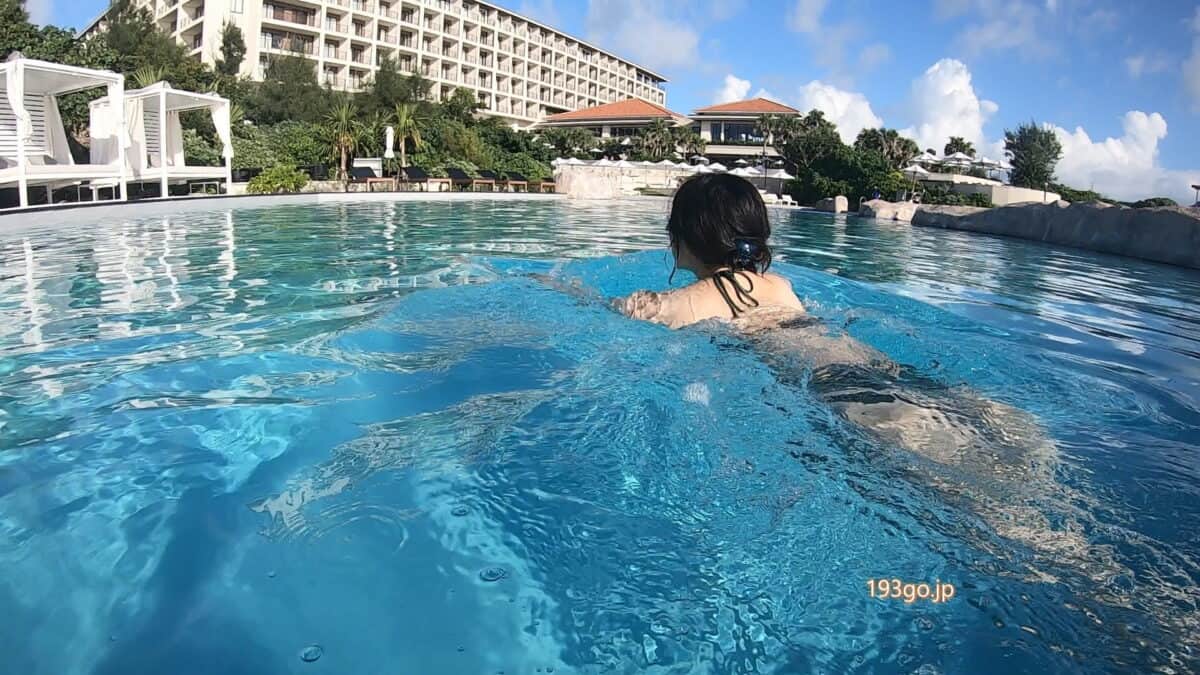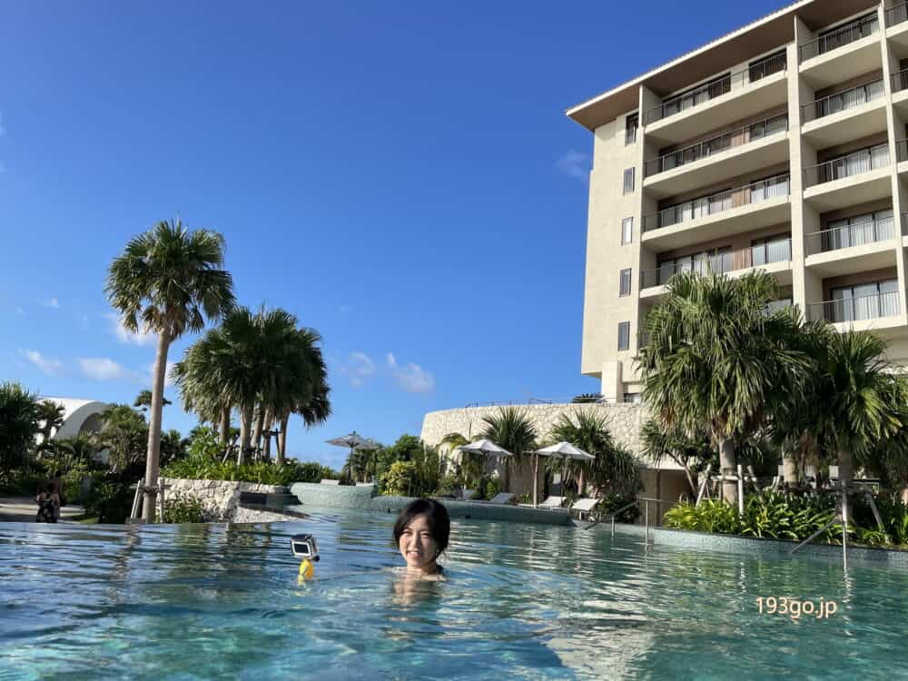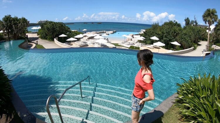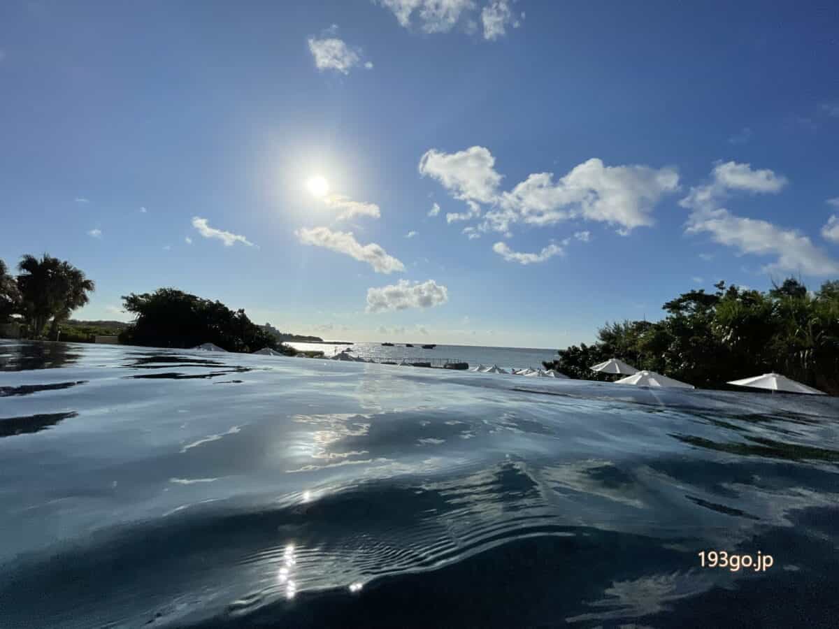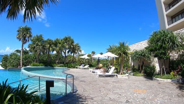 ホテル内にはインドアプールと、屋外にグスクプールと、海水を用いたラグーンがあり、向こうに見える海まで続くような、インフィニティー空間