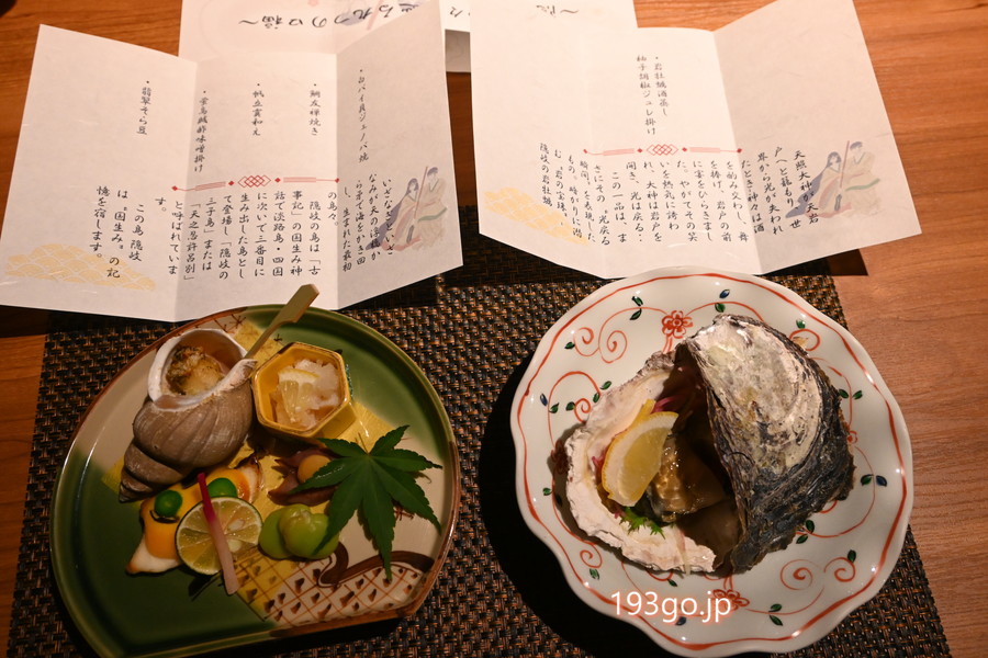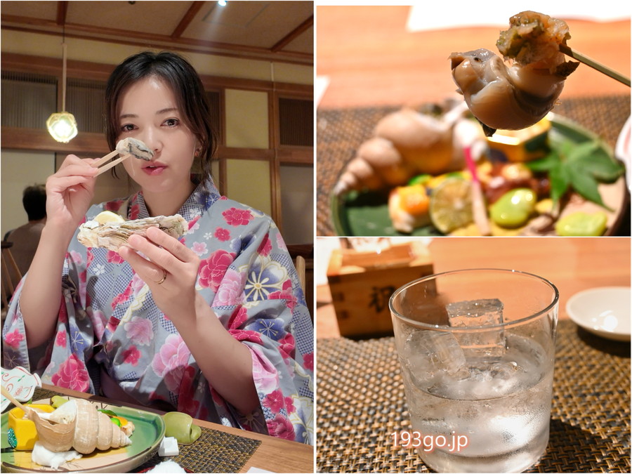 お造りや先付には、隠岐の岩牡蠣、ホタテ、赤海老、サザエ、白ばい貝、地鯵などが登場。新鮮で身が厚く、食感の違いも楽しめた。特に貝類が好きな私には嬉しいラインナップ!