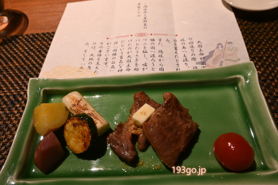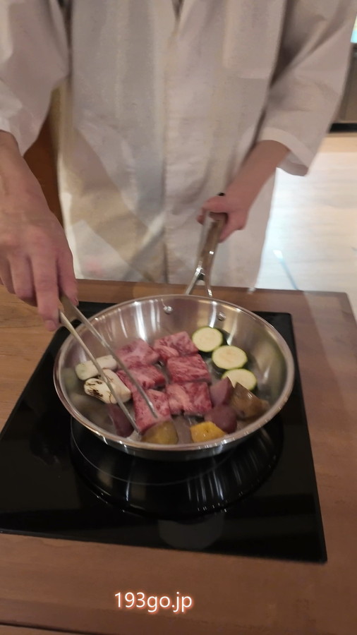 そして、メインの隠岐牛はライブキッチンでシェフが目の前で仕上げてくれる。脂の甘みととろける柔らかさが絶品で、添えられた夏野菜のグリルも素材の味を引き立てていた。