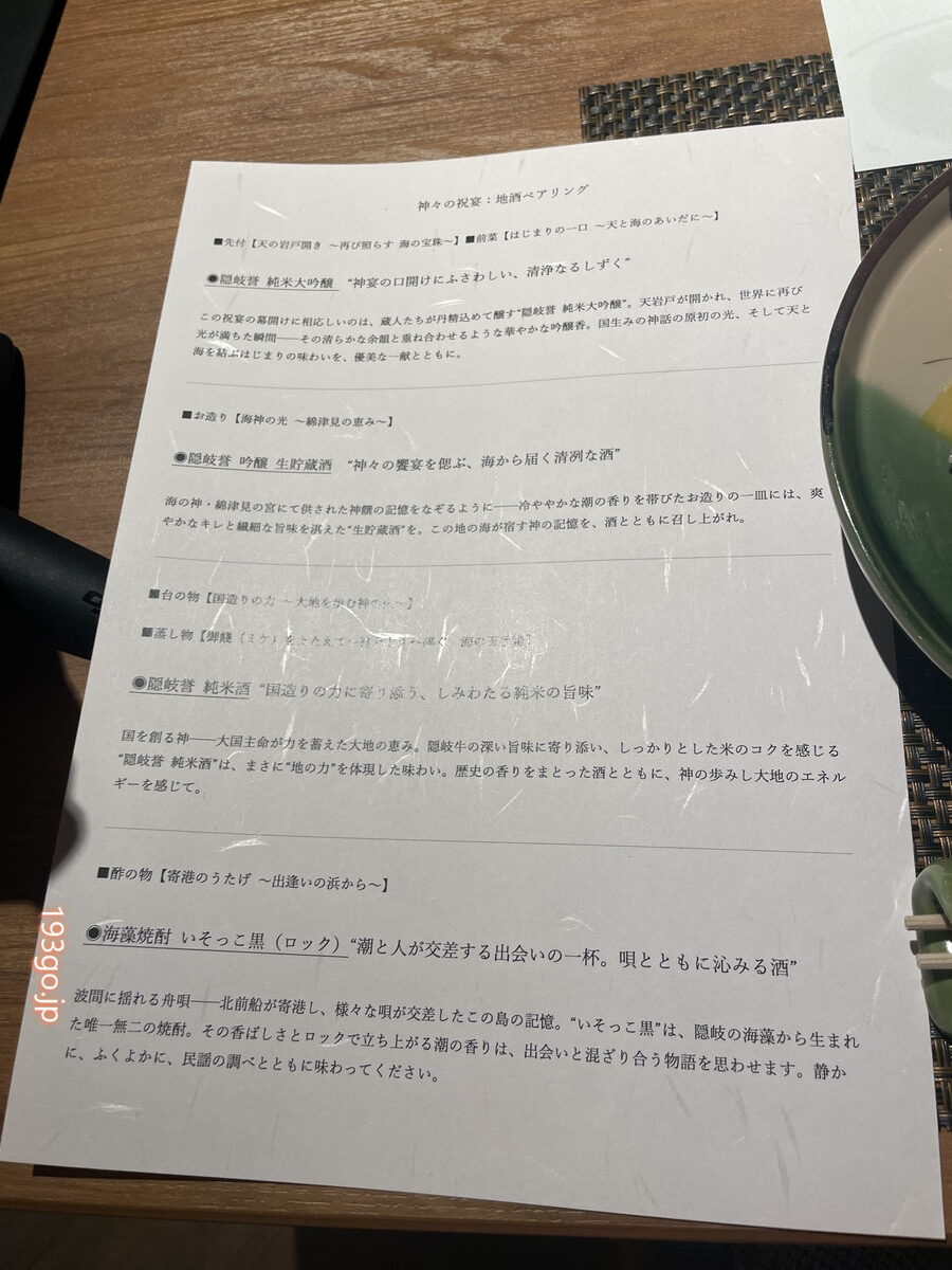 会場では和楽器の生演奏が響き、幻想的な雰囲気。食事は地酒のペアリング付きで、各料理に神話の物語が添えられ、巻物風のお品書きやナレーションでストーリーが進行するという凝った演出。