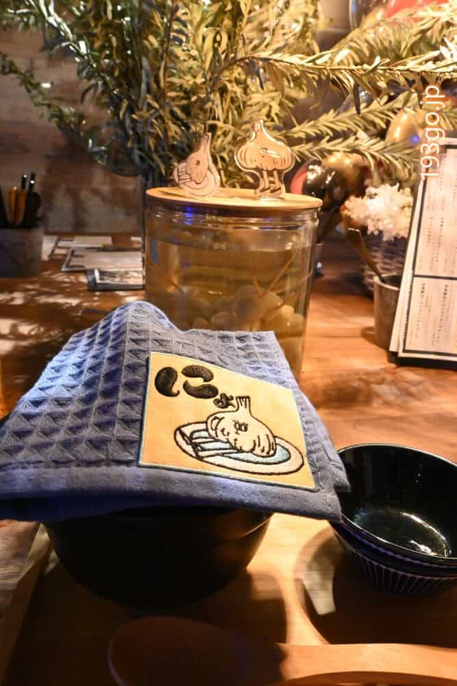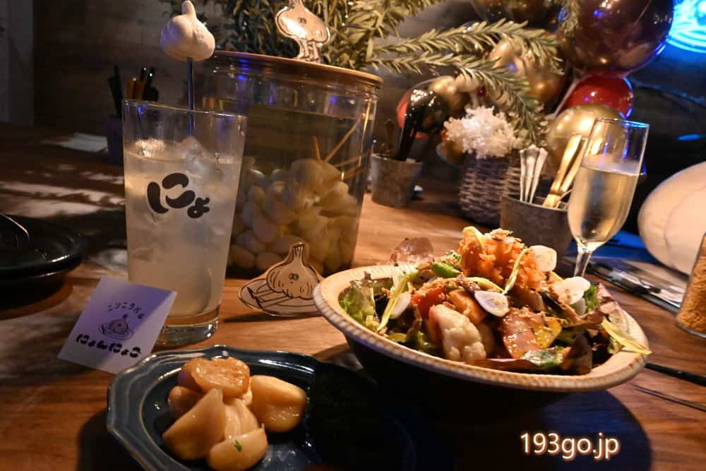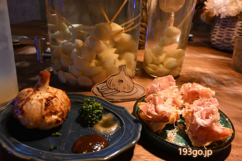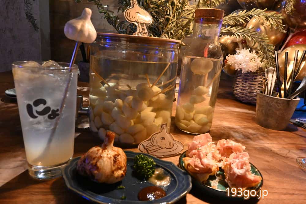 ひらがなで「にょんにょご」の店名がゆるい感じ。お皿に鎮座した、きょとん顔の“ニンニクくん”。