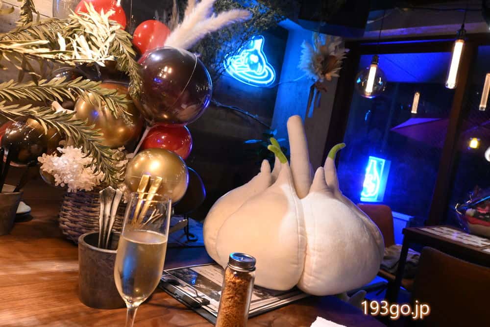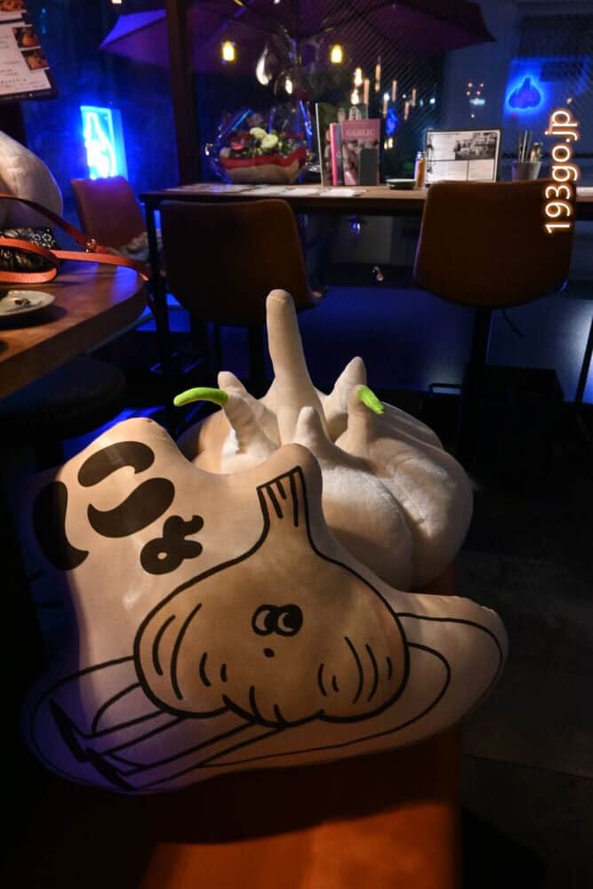 店内はニンニクの様な形の照明がぶら下がり、大きなニンニク型クッション、小物。ニンニクモチーフのグッズが所狭しと置かれてる。