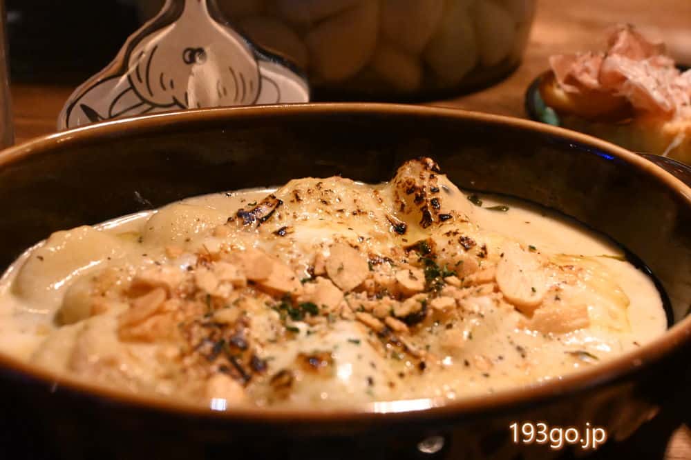 スキレットにグツグツ。トロ~リ、ニンニククリームとラクレットチーズ。もちもちニョッキにニンニクチーズのコク旨。