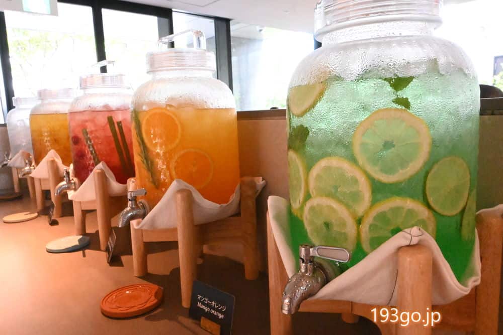 ドリンクは、輪切りフルーツ入りのカラフルなジュースが並ぶ。南国感たっぷり。