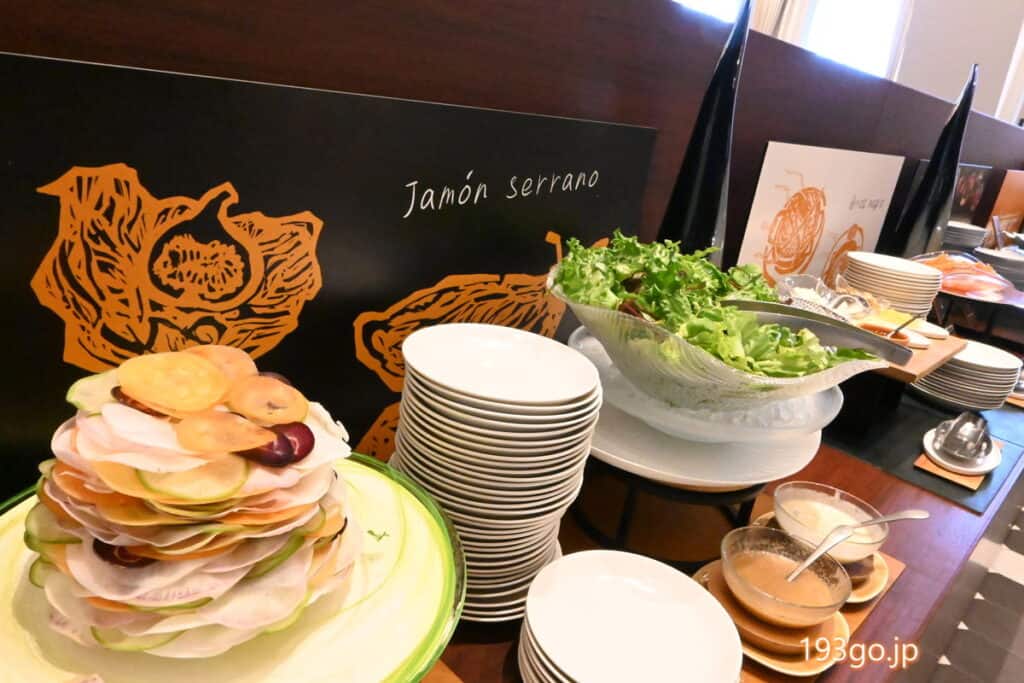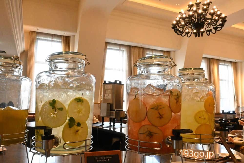 フルーツが入ったデトックスウォーターも数種類、カラフルな根菜はミルフィーユの様に重なり、彩り豊かで目でも楽しめるビュッフェだった。