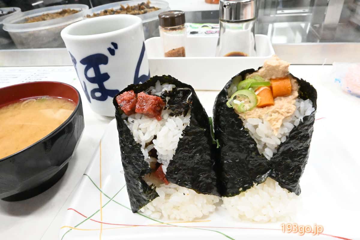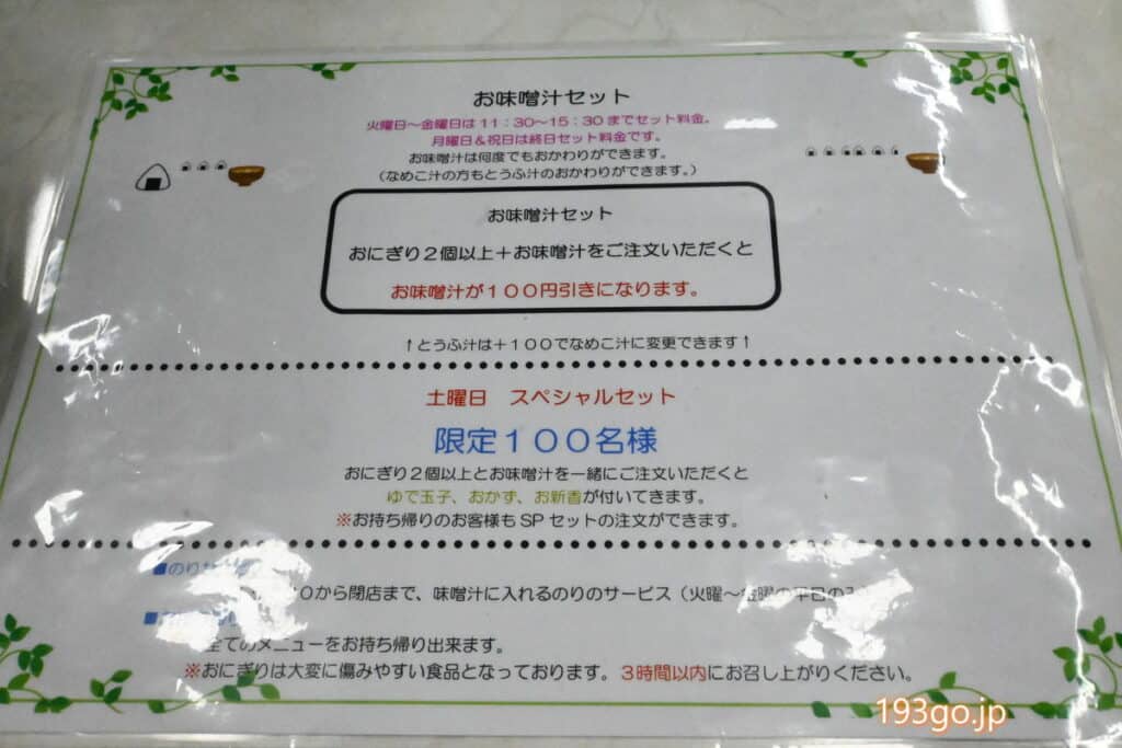(平日15:30までおにぎり2個以上頼むと、みそ汁が100円引き)