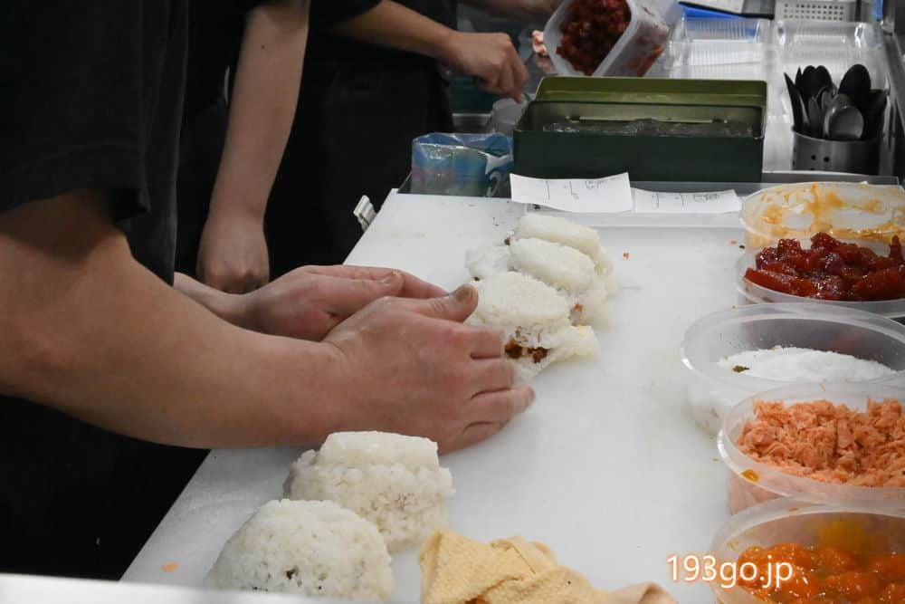 一気に5個おにぎりが作れる型に、ご飯をはめて、具材を乗せ、その上にご飯を乗せ、ひっくり返して形を整え、海苔が巻かれ、提供される。