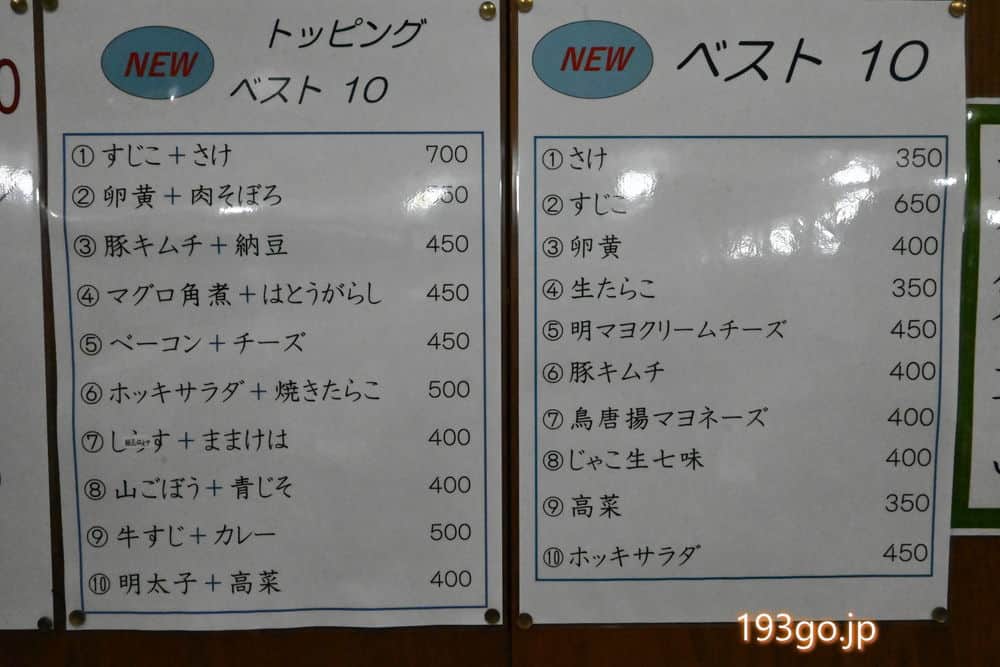 具材の倍増「ばいもり」、ご飯の倍量「大き目」もあるね。(各50円~)