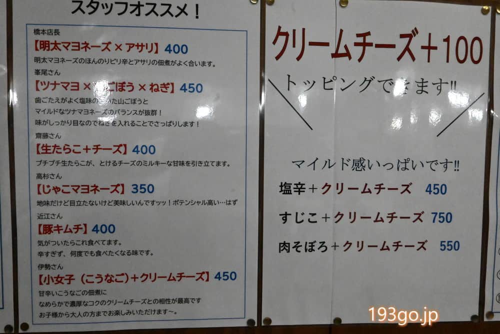 おにぎりメニュー 一個350円~。「トッピング」や「ばいもり」