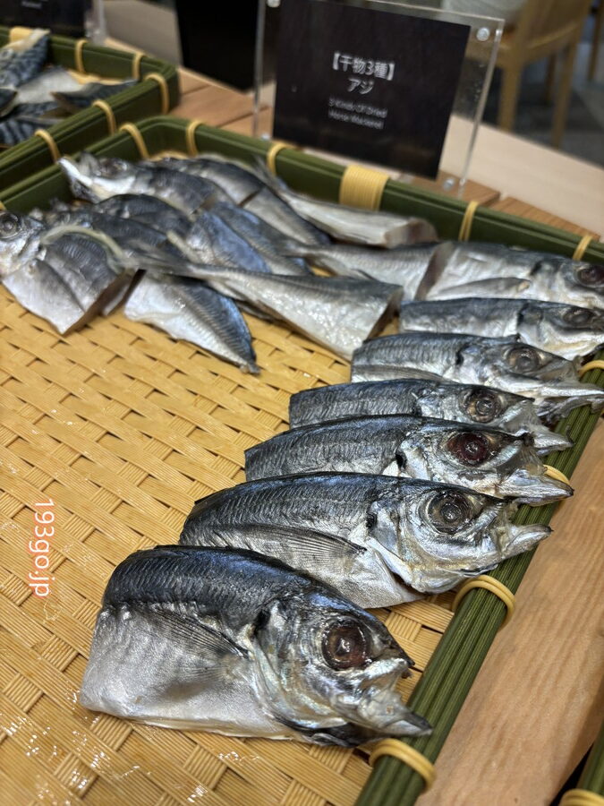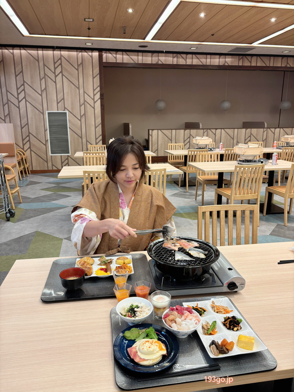 朝食バイキングでは、各テーブルに網があり、干物を焼きながら食べられるのが楽しい。