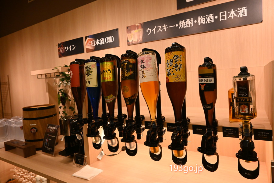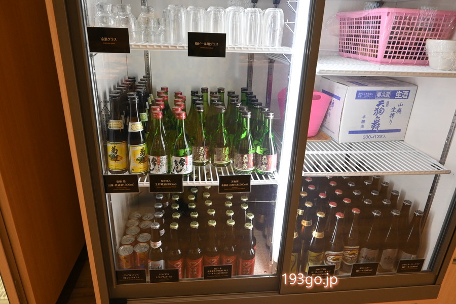 有料アルコールバー(セルフ式)では、生ビール、ハイボール、ワイン、日本酒、梅酒などを自由に注げ、冷蔵庫には地酒や地ビールも用意されている。お風呂上がりの一杯は格別。