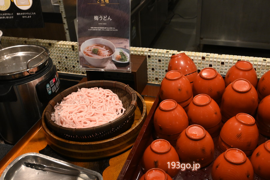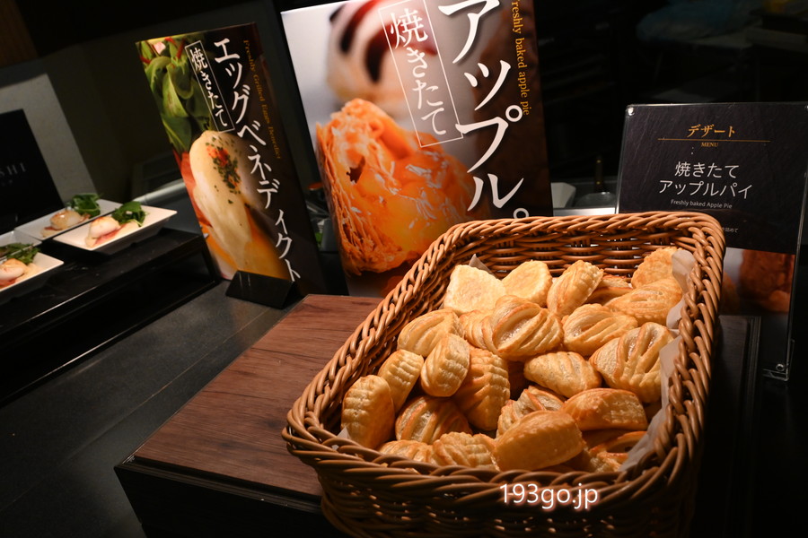 朝食バイキング 旬魚と梅うどん、エッグスラットに焼きたてアップルパイ