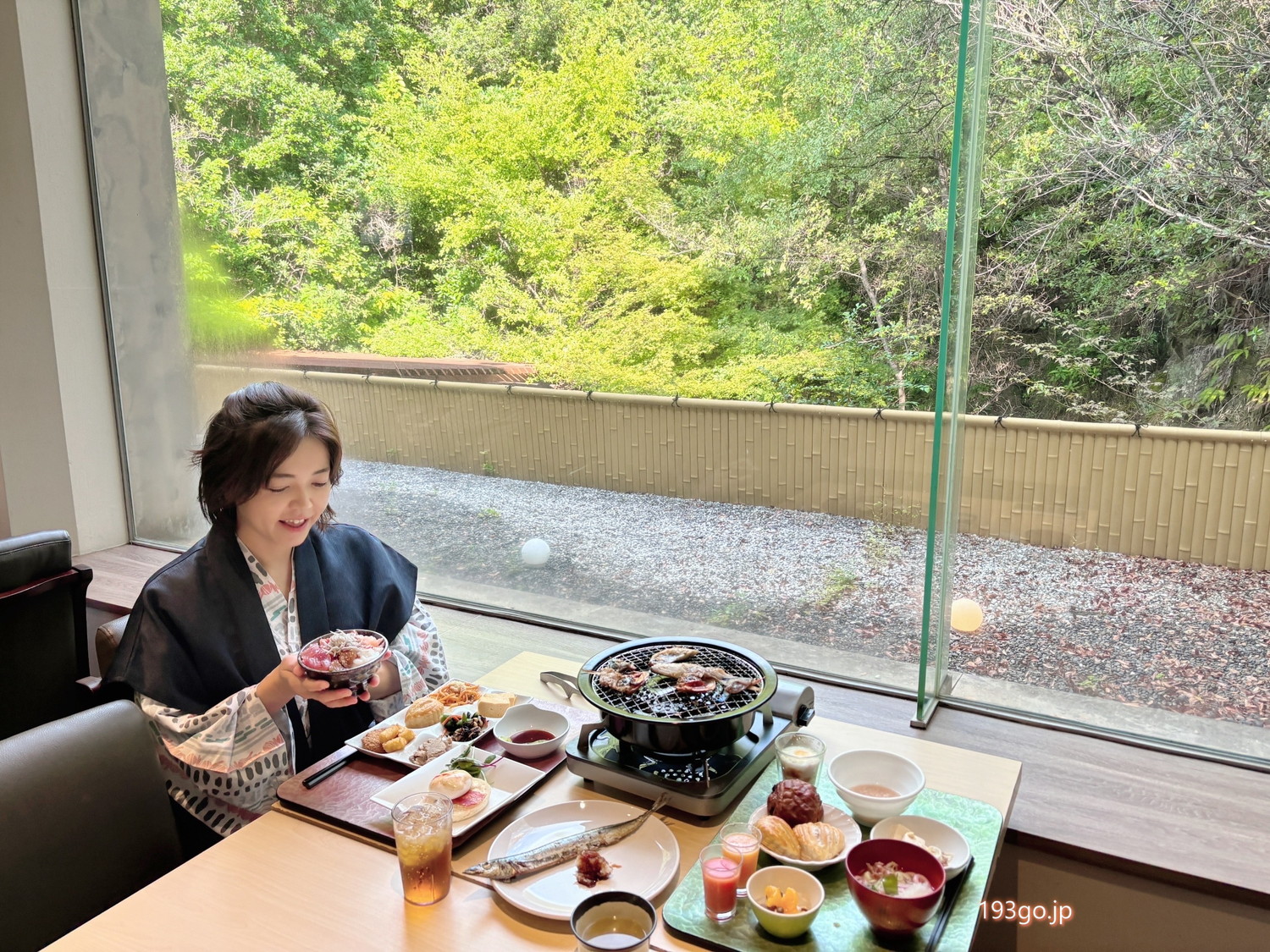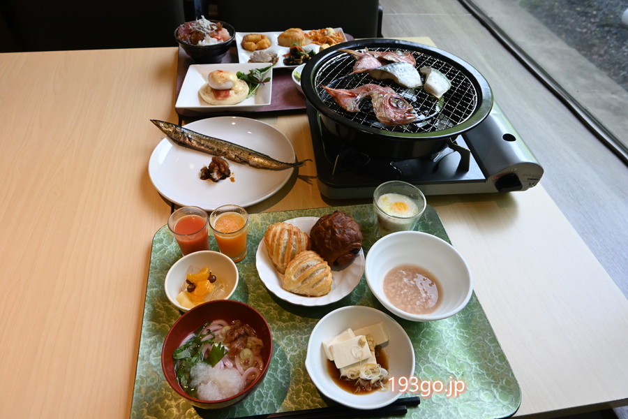 朝食は網の上で炙っていただく干物や旬の秋刀魚、海鮮丼づくりに鯛出汁茶づけ、