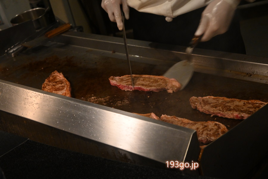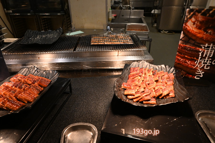 ライブキッチンでは天ぷら、鰻蒲焼き、ステーキ、すき焼きなど出来立ての料理を提供。