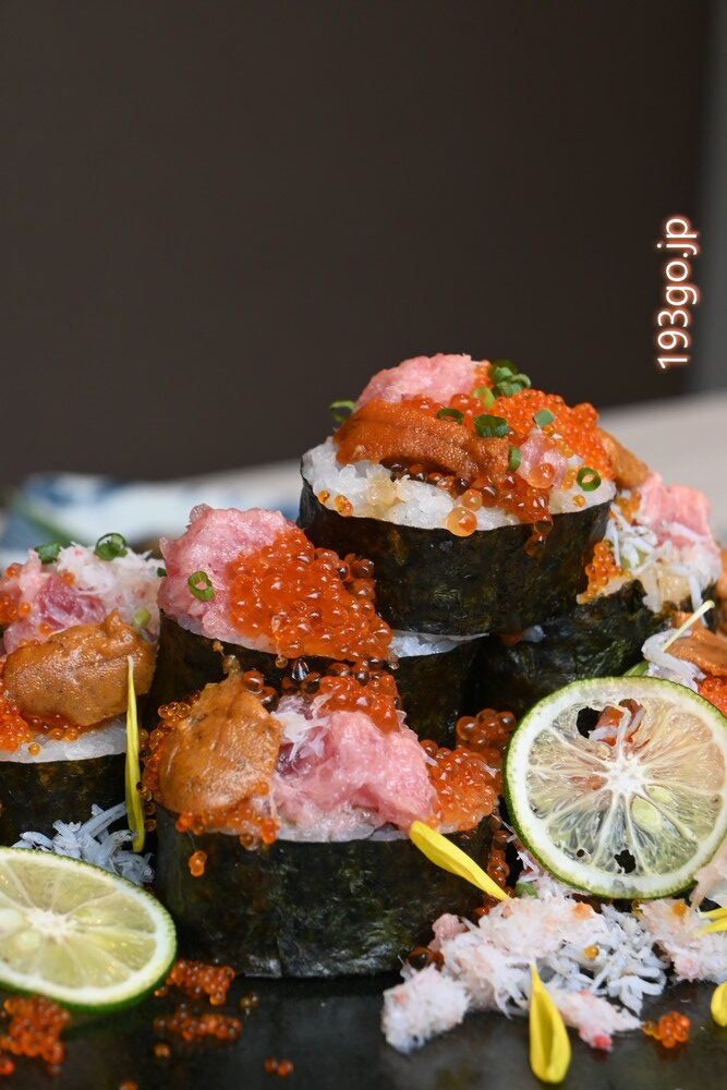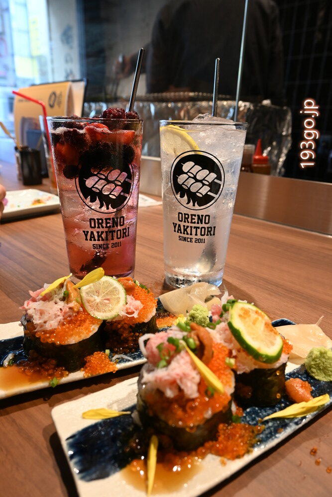 焼き鳥だけでなく、鮮度抜群のレバ刺しや、ウニ・蟹・ネギトロ・イクラなどの海鮮がてんこ盛りの「俺の巻き寿司 極」なども名物メニューに。