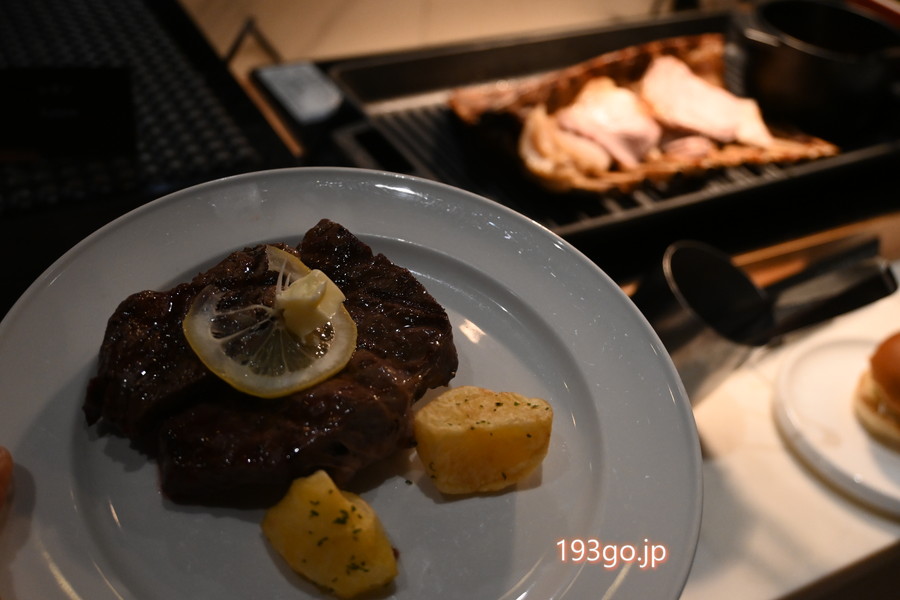 ライブキッチンではステーキやマグロカツバーガー、搾りたてモンブランなど作り立ての料理を提供。
