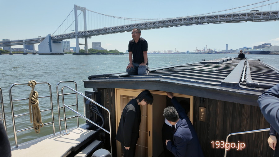 受付を済ませ、船着き場横のプレハブで待機し、いざ黒塗りの屋形船へ。