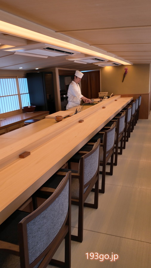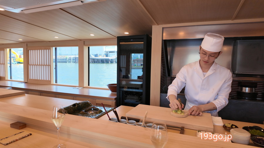 船内に一歩入ると、まるで高級和食店のような白木の鮨カウンターが目の前に。