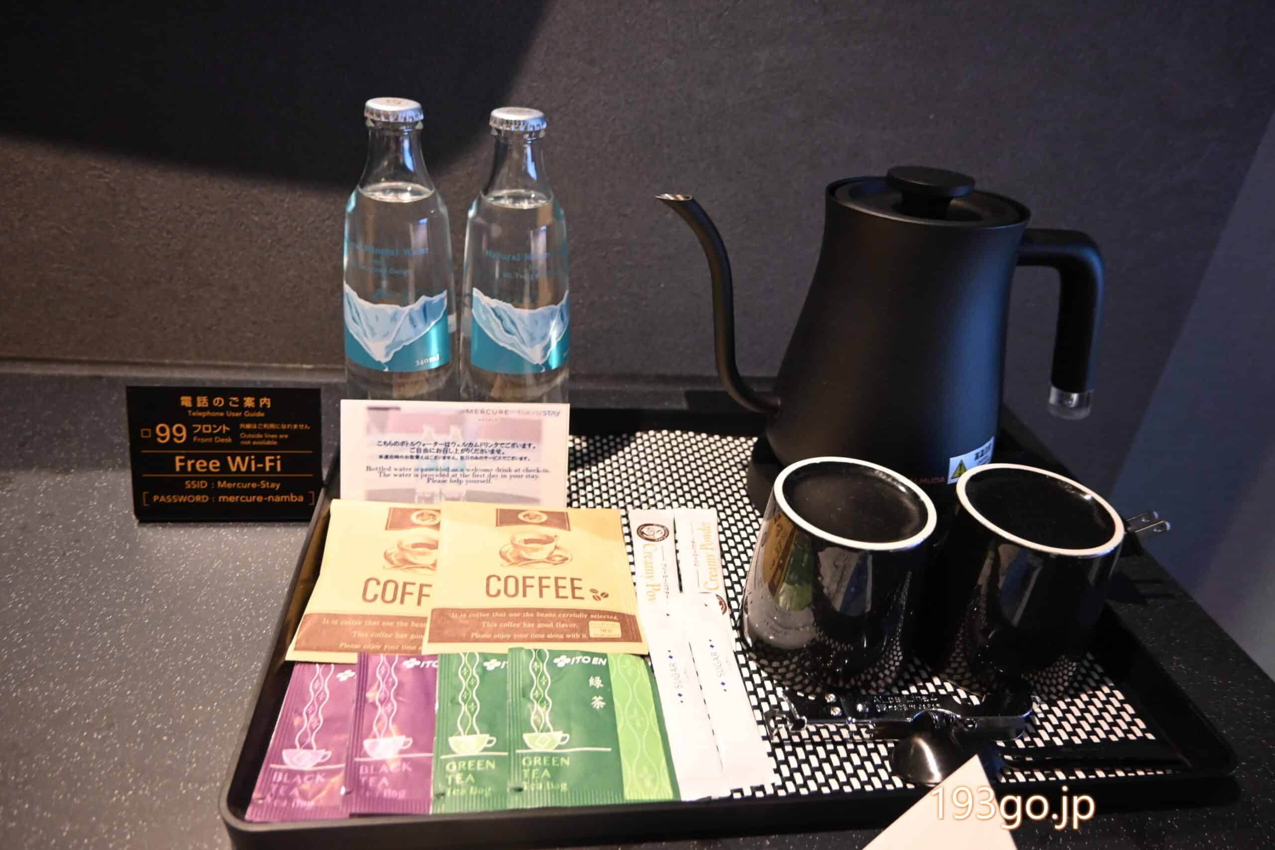 フリーウォーター、電子ケトル、ティーバッグ、コーヒーなど。