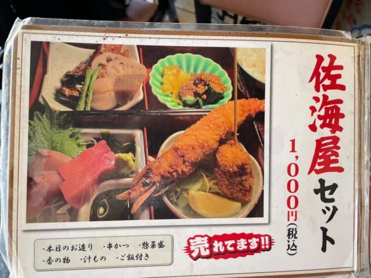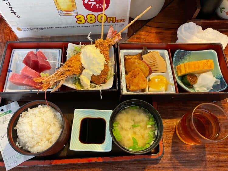 2段重ねの定食で、まぐろ刺身に煮物に、玉子焼き、みそ汁付き。揚げ物は串カツ&海老フライ!
