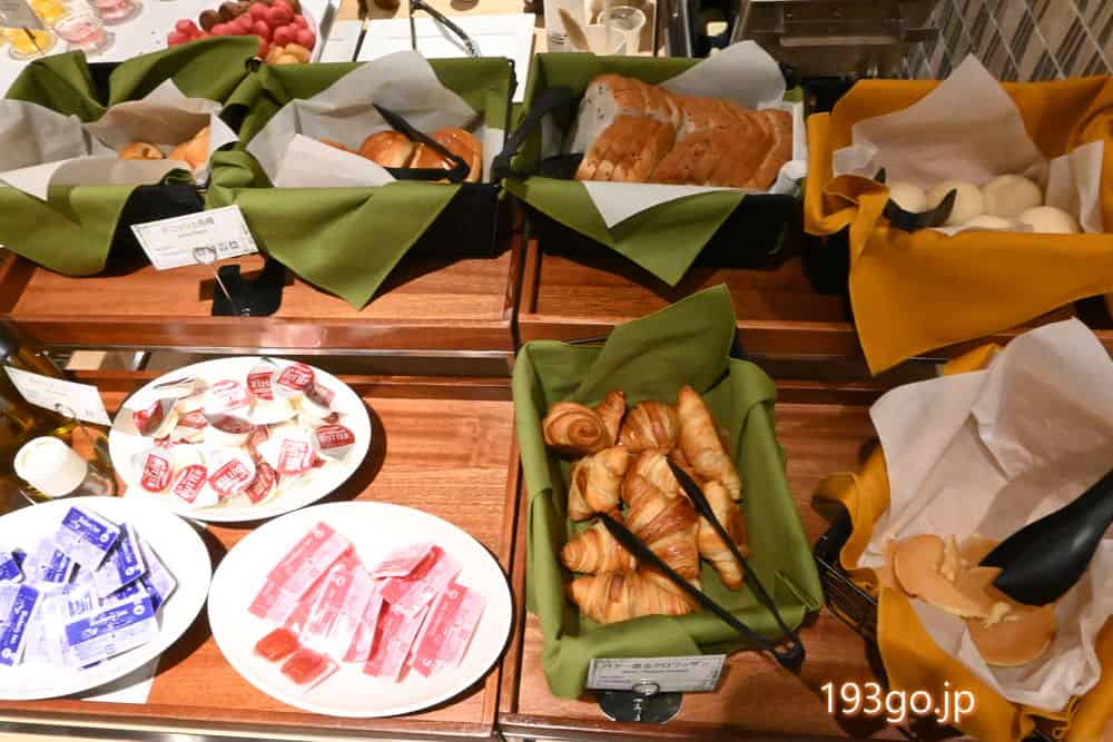 パンはクロワッサンやデニッシュ、セサミパン、白いパン、パンケーキなどミニサイズで色々。