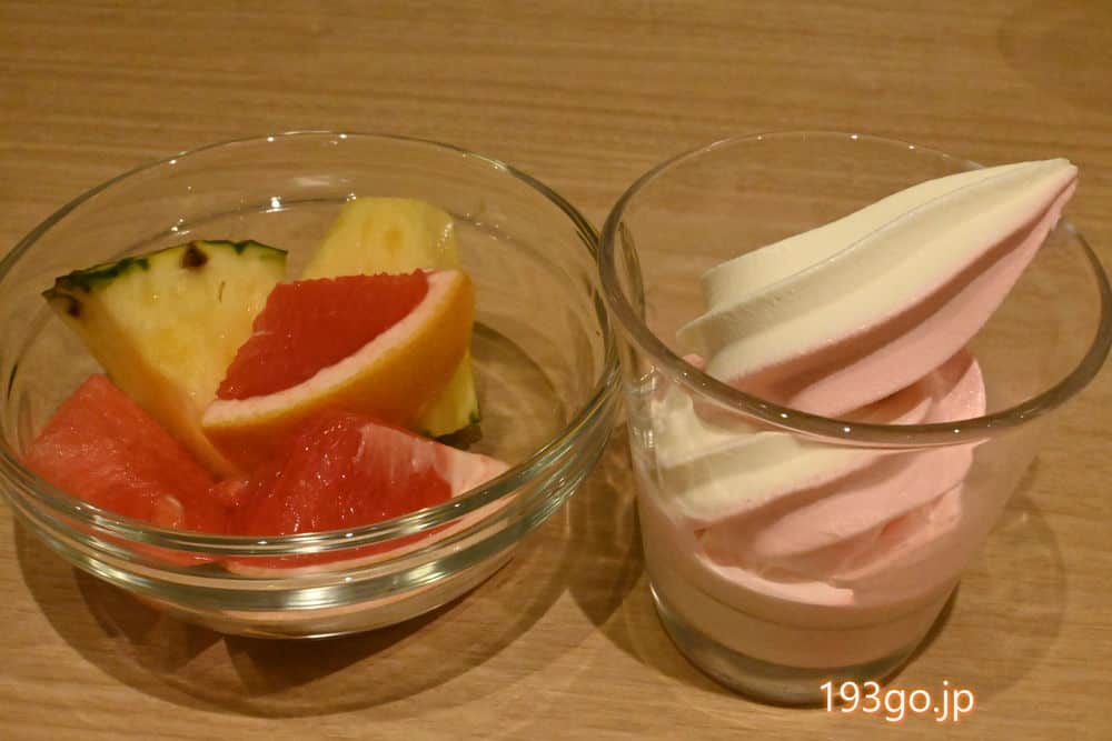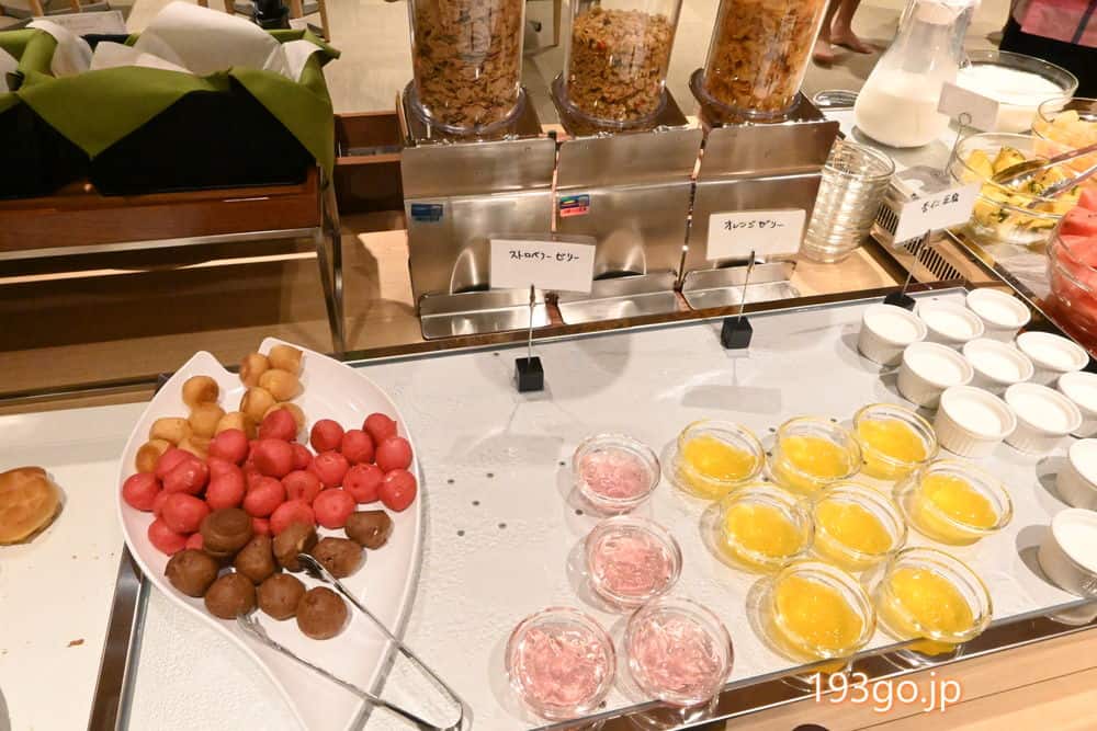 デザートはわらび餅、プチシュー、ゼリー、杏仁豆腐などが並んでいた。ソフトクリーム作りも。
