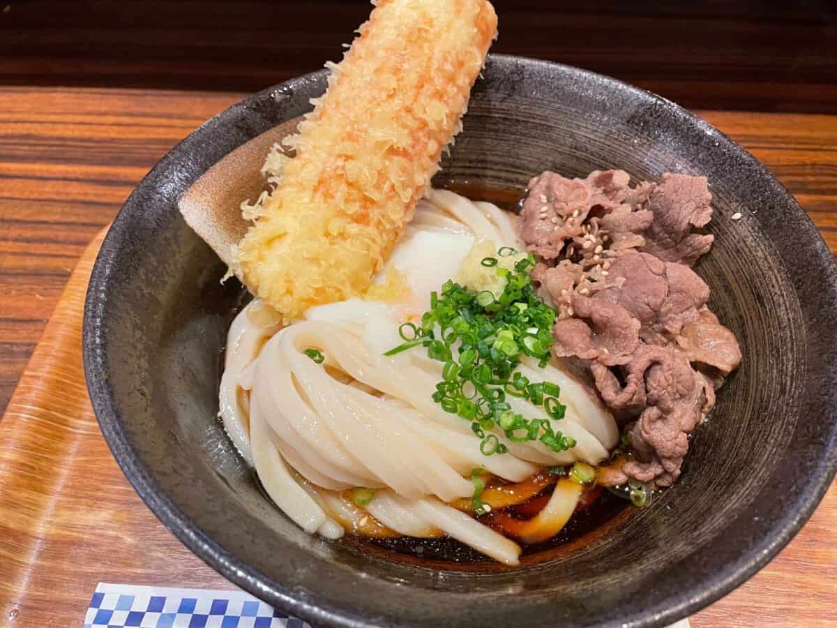 高級感のある黒い丼にツヤツヤのうどん。鮮やかな刻みネギとお肉、ちくわ天が一本乗っている