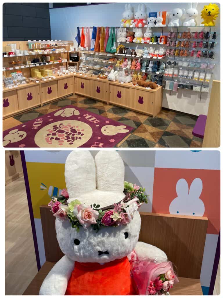 人気商品「こはく糖」をイメージしたオブジェや、ミッフィーたちと撮影を楽しめるフォトスポットもあり、甘い夢の中にいるような世界観でお土産選びが楽しい!