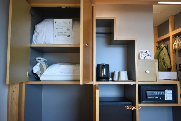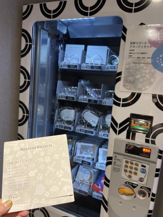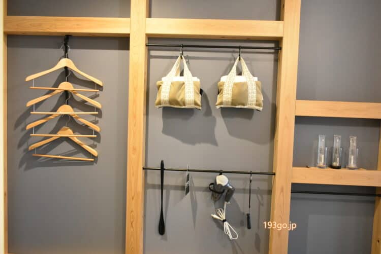 4Fエレベーター前に、歯ブラシ、ヘアブラシ、カミソリなど無料アメニティーと、滞在着(部屋に用意がない)が上下セット200円で貸し出しあり。