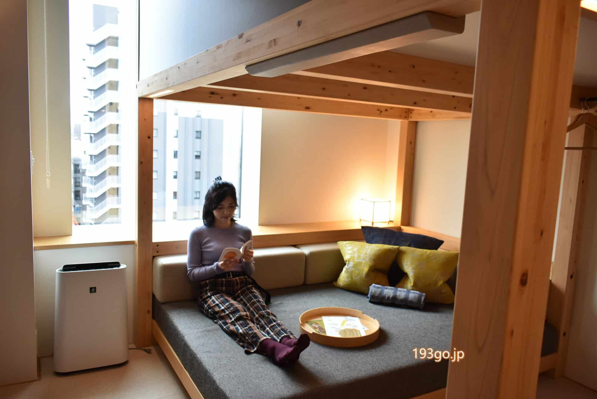 ヒノキ材を使用した立体的なやぐらは、上段がベッドスペースで下段がくつろぎソファ。