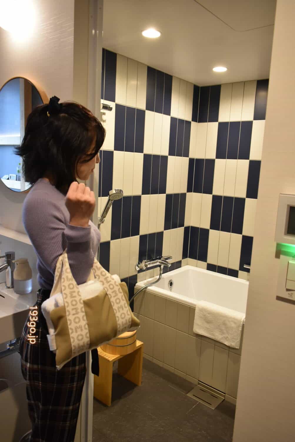 ドライヤーやタオルセット、TV、鏡は仕掛け壁に集約されてて、コンパクトだけど空間は広々。今風のデザイン!