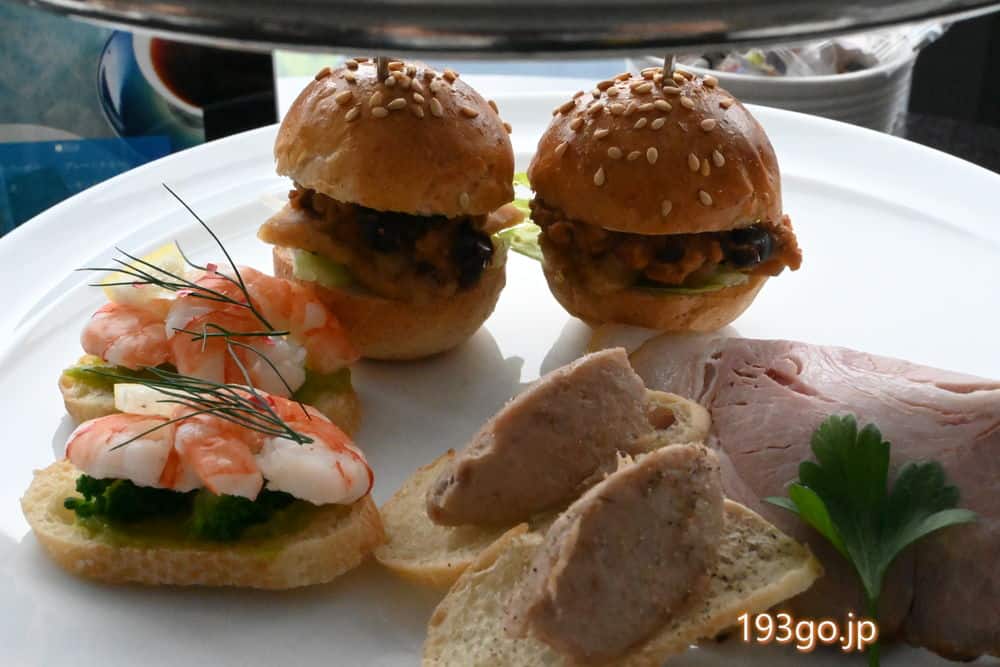 下段はお食事メニュー(セイボリー)で、ミニバーガーや海老とアボカドのオープンサンド、自家製ハムと鴨のリエット。