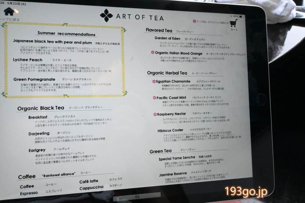 時間中飲み替え自由な紅茶は、カリフォルニア州ロサンゼルスのお茶ブランド「ART OF TEA(アートオブティー)」。気になるドリンクをタブレットで注文。