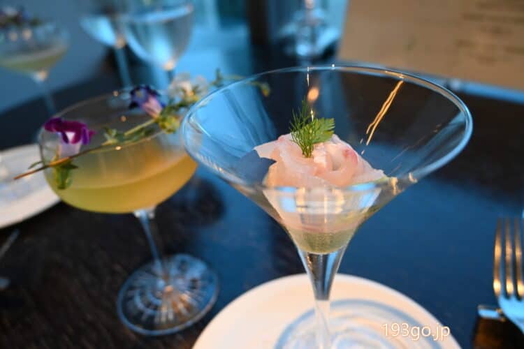カクテルグラスに盛り付けられたシェフの特製アミューズ。
