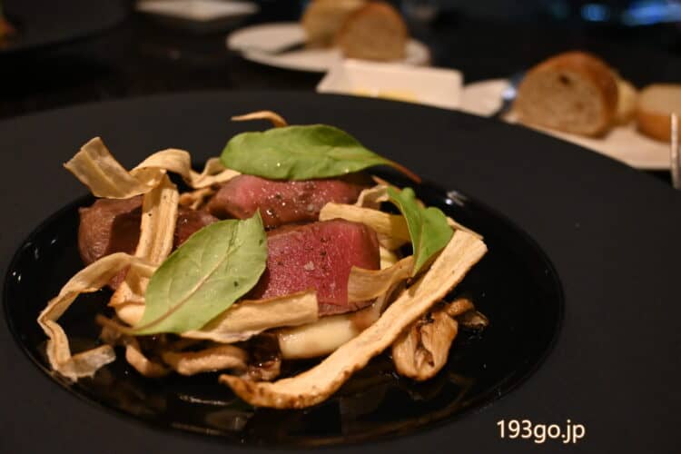 ゴボウのスライスやキノコの付け合わせ、これ等もソースと合う。