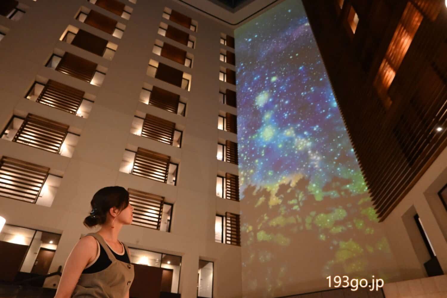 移り行く、高さ30mの壁面アートも幻想的。