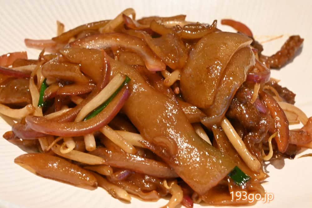 オイスター風味のソースで仕上げたモチモチの米粉のヌードル。一緒に炒めてあるユリネのサクサク食感も楽しい