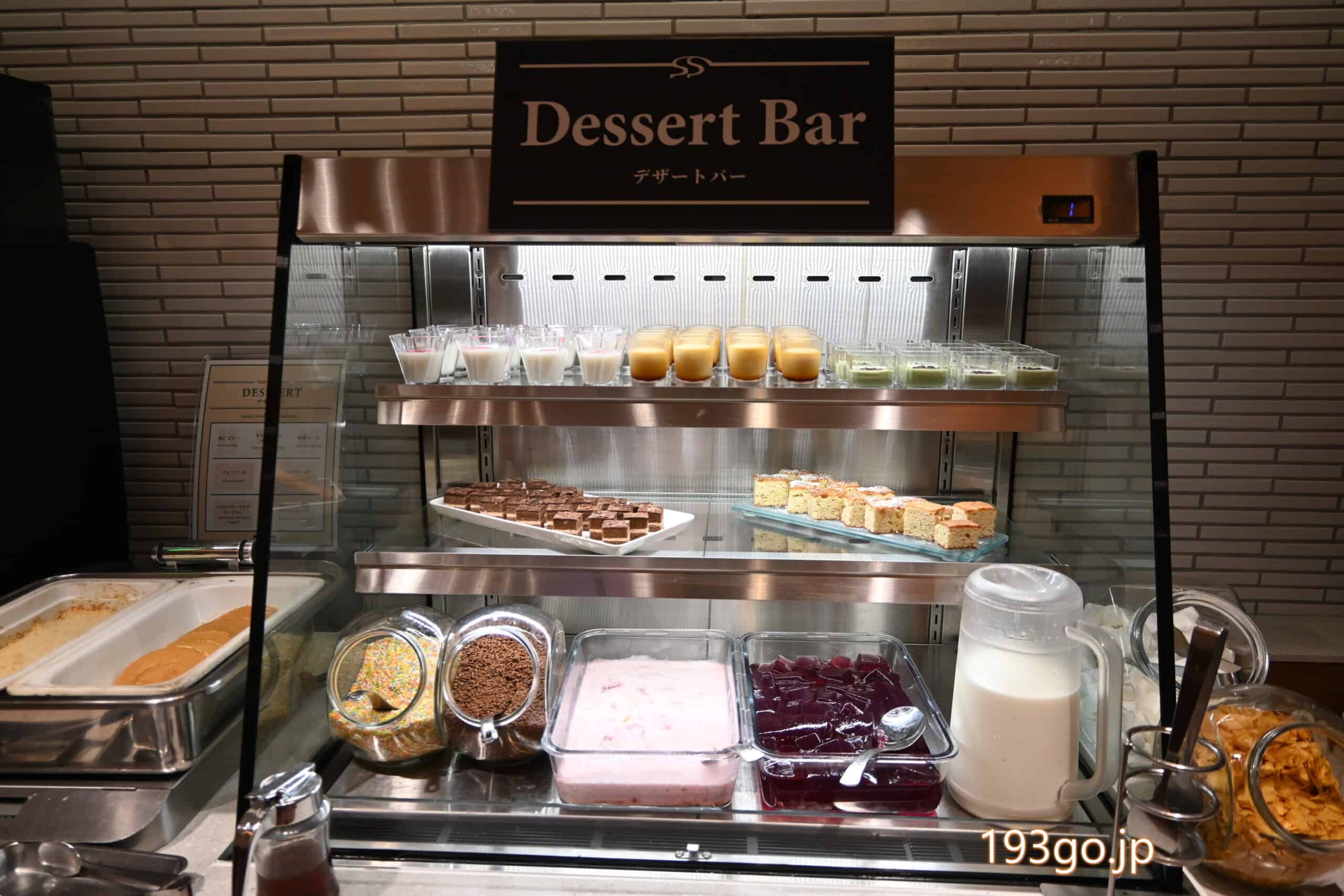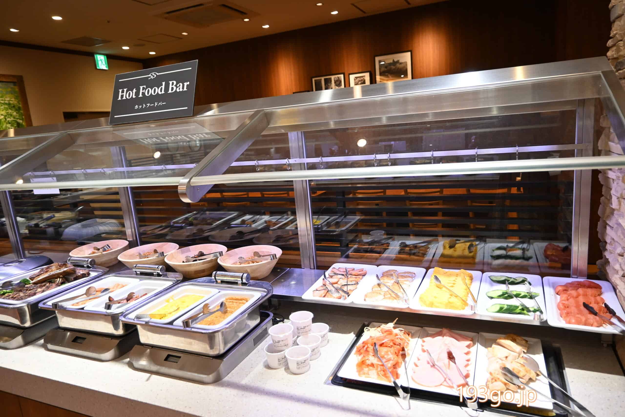 ビュッフェ台に、洋食、和食、サラダバー、フルーツ、スープ、デザート、ドリンクのコーナー。