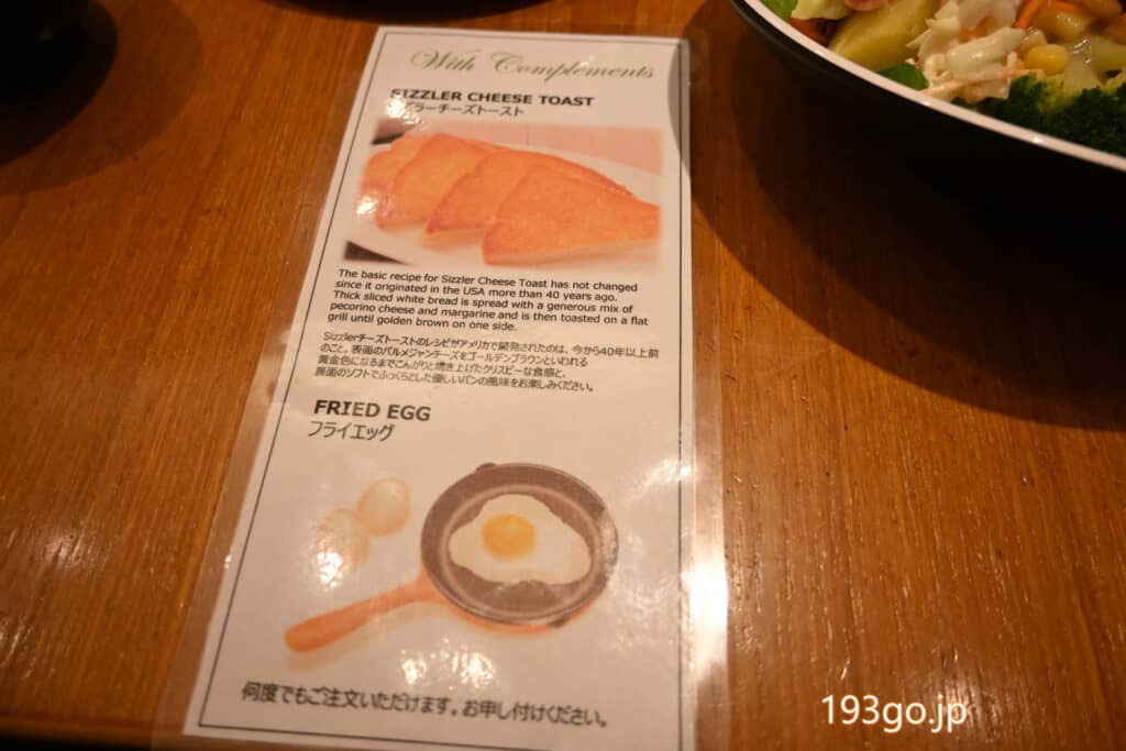 また、シズラーチーズトースト、フライエッグ(目玉焼き)は、焼きたてを席に運んでもらえる。こちらもお替りが出来る。
