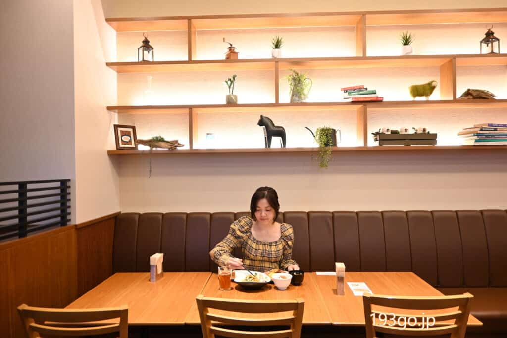 壁に本がレイアウトされたおしゃれな席へ。