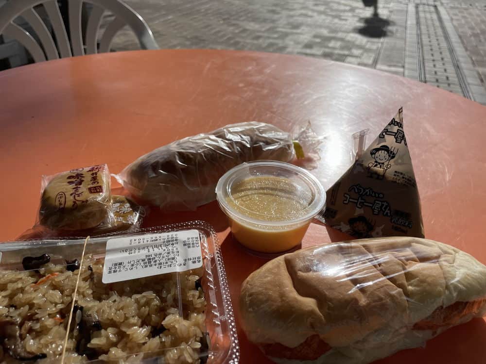 おこわやパン、コーヒー牛乳、プリン、味噌まんじゅうなどを購入して園内の休憩スペースで朝食を。おこわはまだ温かくて、パンはフカフカ。地元食材の手作り感のあるご飯が美味しい。
