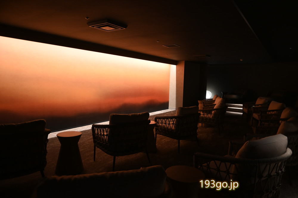 大スクリーンがあるスペースでは、八ヶ岳の朝焼けかサンセットをイメージした映像が流れるヒーリングタイム。このままここで寝ちゃいそう!