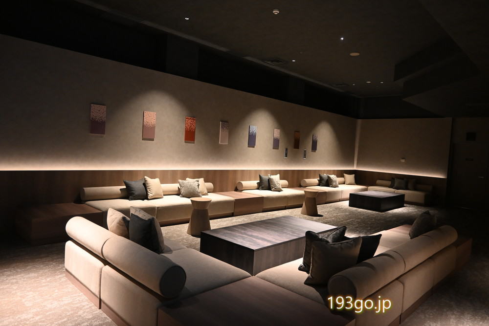やわらかな光にほんのりと照らされた落ち着いた空間で、湯上がりに喉を潤したり、ソファでひと休み。