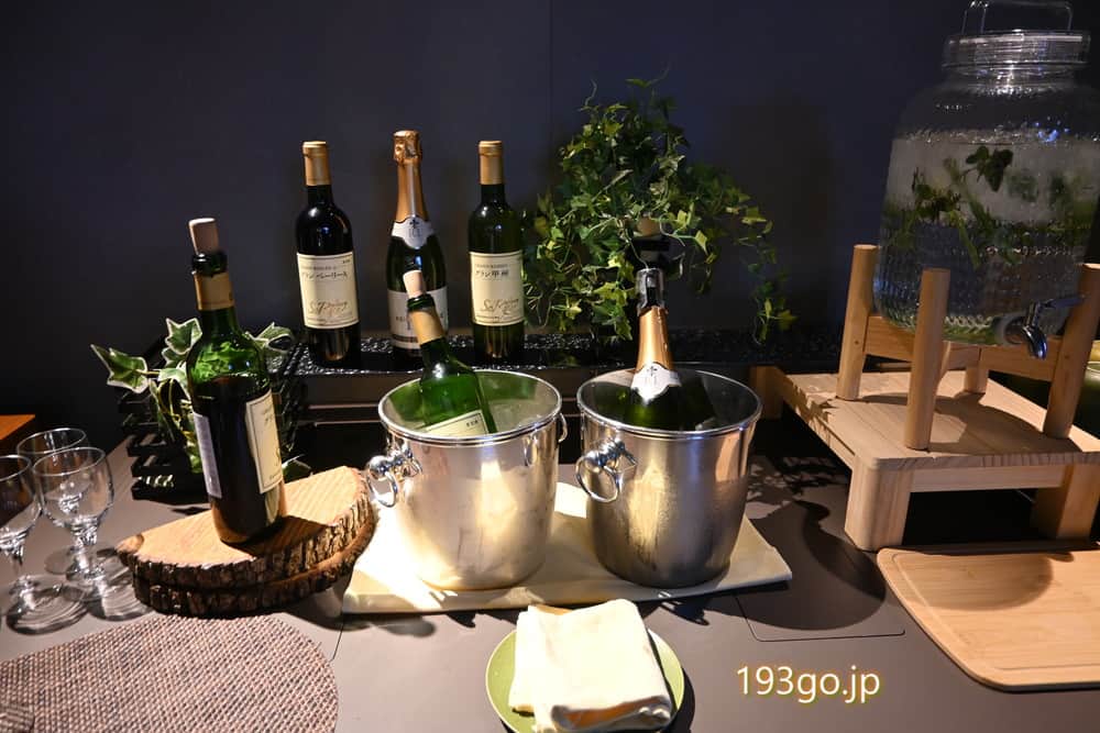 赤ワインや白ワイン、ビールなどのお酒や、コーヒー、紅茶、ハーブウォーターなどのソフトドリンクが並ぶ。